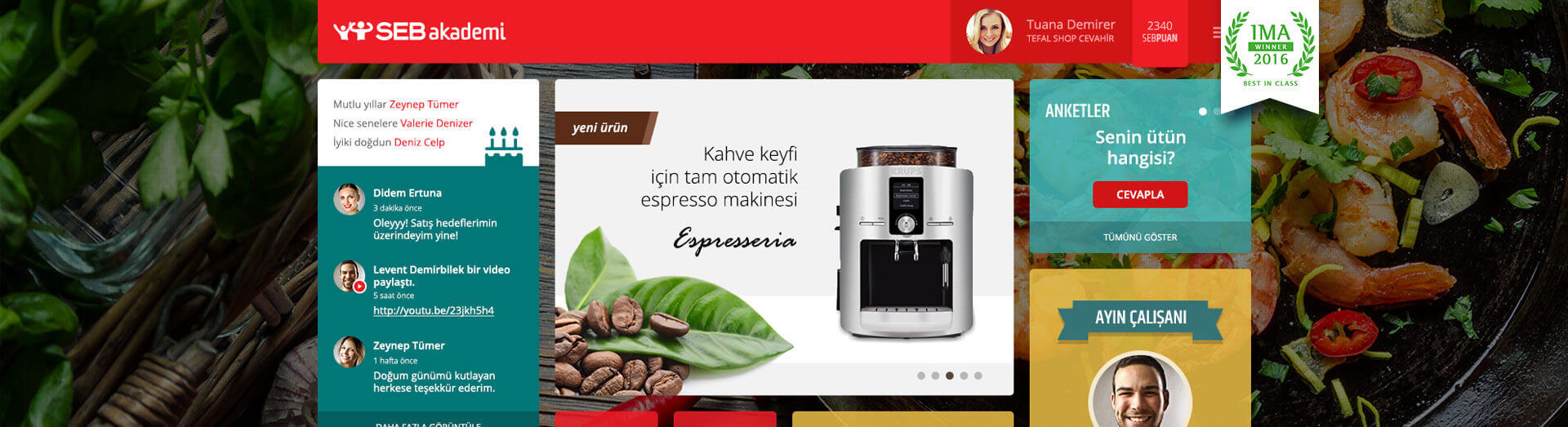 Tefal’de eğitim şart! Satış danışmanlarının Tefal, Moulinex ve diğer SEB Groupe markalı ürünleri iyi tanıması ve müşterilerine en doğru hizmeti vermesi olmazsa olmaz. Biz de hem Tefal Shop’larda hem de dış mağazalarda çalışan SEB satış danışmanları için eğitim dokümanlarını ve videolarını inceleyebildikleri devamında eğitim testleri ile bilgilerini pekiştirdiği, kurum içi sosyalliği ve satış takibini yapabildikleri bir intranet hazırladık, Tefal’den yıldızlı pekiyiyi kaptık.